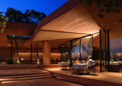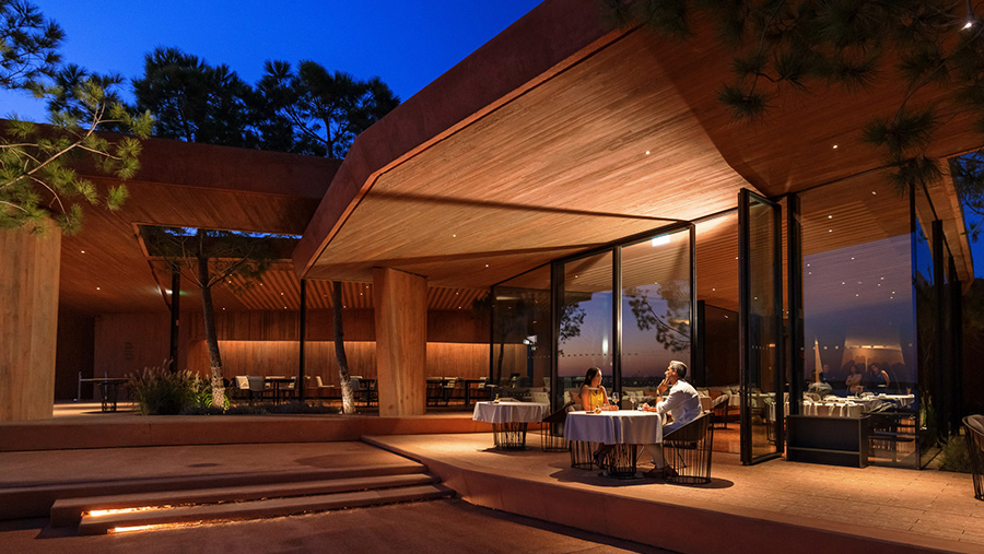 Een plek waar je terechtkunt voor ontspanning, eten en een goed gesprek, met zicht op de baan en de kust. De architectuur draagt duidelijk de handtekening van RCR Arquitectes, strak en rustig, zonder kil te worden.