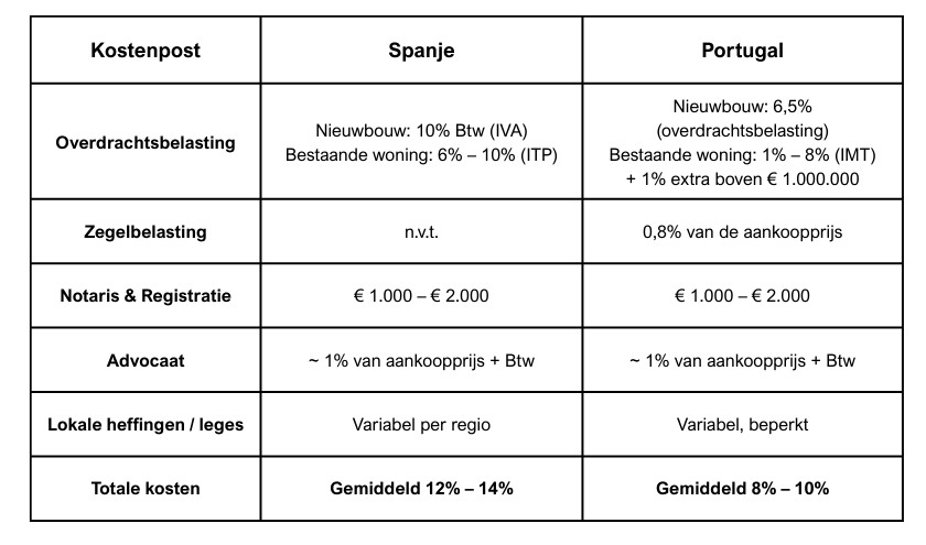 In Spanje ligt je totaal meestal rond de 12%–14% bovenop de koopsom, in Portugal is dat vaak 8%–10%. Dat zijn indicatieve percentages; de exacte kosten hangen af van de regio, het type woning en je persoonlijke situatie.